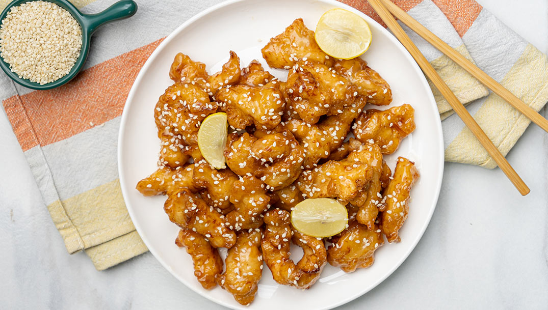 - Vend den sprøde kylling i citronsaucen, og anret på et fad. Drys sesamfrø over for ekstra smag og pynt.