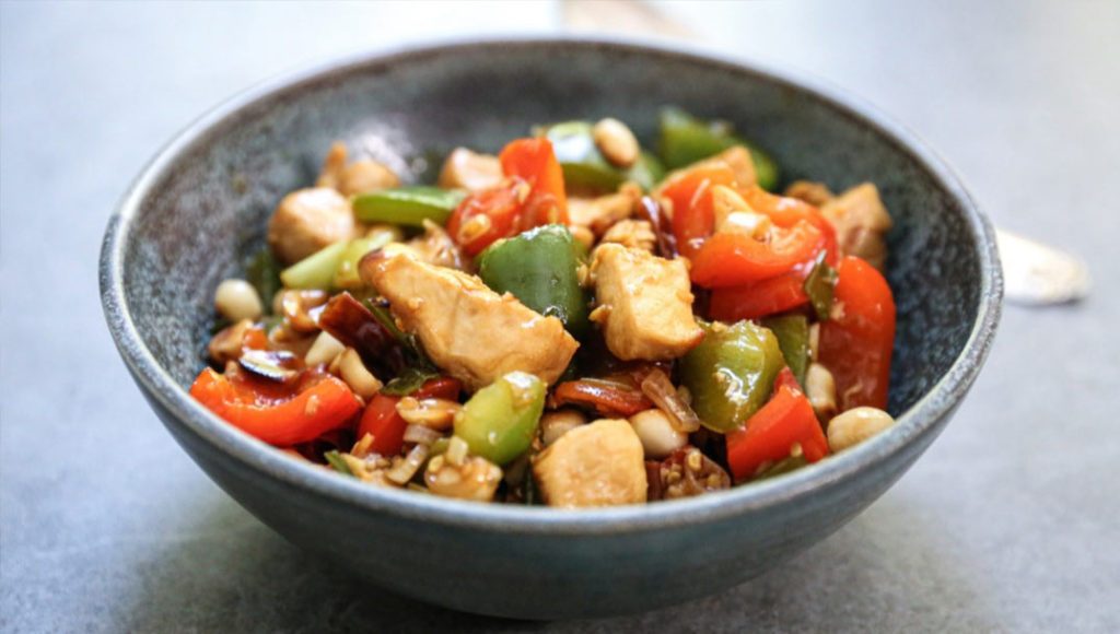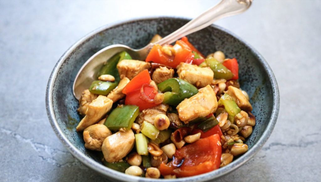 Hovedingrediensen i Kung Pao Chicken er saftige stykker kylling, der steges med forskellige grøntsager, krydderier og sprøde peanuts, der tilføjer en skøn knasende tekstur til retten.