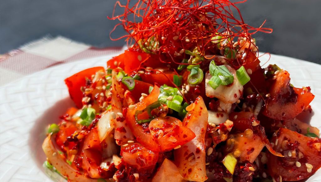 Bland sukker, gochugaru, fiskesauce og ristede sesamfrø i en skål og rør dernæst de hakkede grøntsager sammen med blandingen. Vend forsigtigt tomaterne deri og server straks eller lad tomatkimchien trække i en times tid på køl.