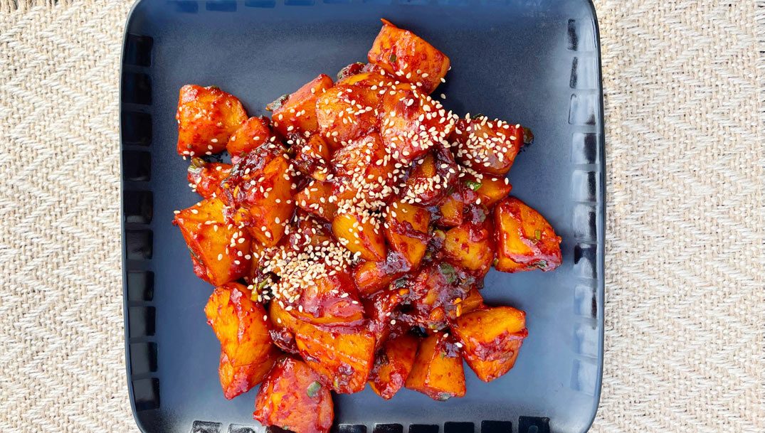 Koreansk madkultur er særligt kendt for sine krydrede og flotte røde retter, og denne ret repræsenterer begge dele. Opskriften på én af de mest populære koreanske side dishes, nemlig braiserede krydrede kartofler, kombinerer møre kartofler med en fyldig, aromatisk og ildrød sauce, der giver dig sved på panden, men uden at blive alt for stærk.