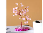 Rosakvarts er kendt for sit blide, lyserøde udtryk og bruges ofte i indretning, hvor man ønsker et varmt og harmonisk visuelt element. Kombinationen af stenene og den farvede agatfod gør træet velegnet som både diskret pynt og dekorativt blikfang.