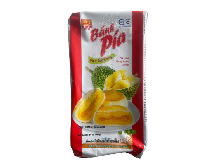 Bánh Pía Mung Bean Durian Cake er en sensation af smag, der forener de delikate nuancer af mungbønner med den karakteristiske aroma af durian. Denne konfekturemesterklasse er skabt med omhu og ekspertise for at levere en uovertruffen smagsoplevelse.
