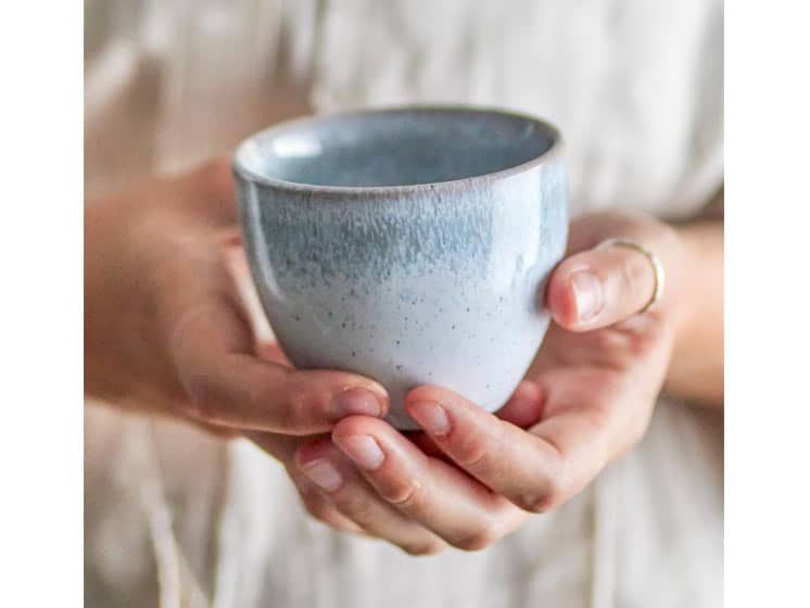 Nyd din te, kaffe eller matcha i en smuk Paula-kop i blå stentøj, hvor nordisk design og håndlavet karakter mødes i en rolig og elegant helhed.