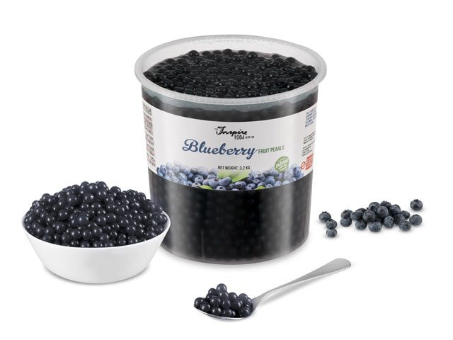 Vand, fruktose-glukose sirup, blåbærjuice fra koncentrat 15%, stivelse, surhedsregulerende middel: calciumlaktat; syremidler: citronsyre; geleringsmiddel: natriumalginat; fortykningsmiddel: xanthangummi; blåbær smag 0,585%, farvestof: anthocyaniner: farvestof: vegetabilsk kul; konserveringsmiddel: kaliumsorbat.Næringsdeklaration: