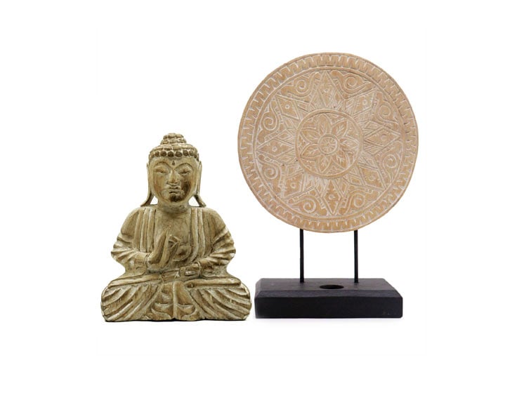 Dette Buddha Feng Shui-sæt kombinerer en håndskåret Buddha-figur med et elegant mandala-symbol på stand. Begge dele er udført i bæredygtigt albasia-træ og holdt i en naturlig finish, der fremhæver træets struktur og giver et roligt, jordnært udtryk.