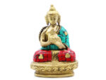 Denne Buddha-figur er håndlavet i massiv messing af dygtige håndværkere i det gamle Delhi, Indien. Figuren er udført med stor detaljegrad og dekoreret med indlagte sten i røde og turkise nuancer, som giver et levende og autentisk udtryk. Den kompakte størrelse kombineret med den solide vægt gør figuren både dekorativ og kvalitetsmæssigt overbevisende.