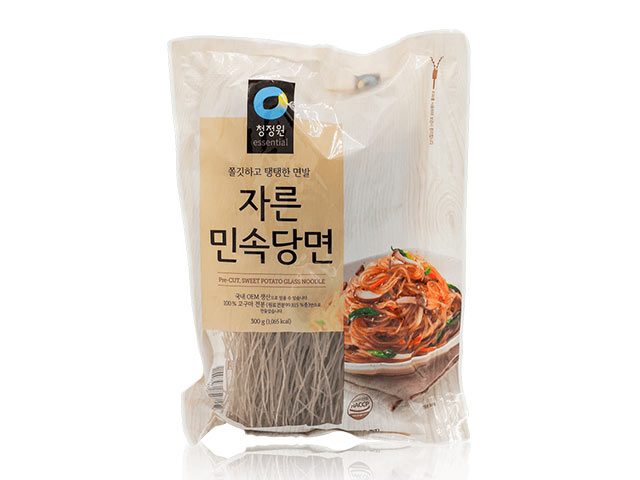 Koreansk glasnudle (Dangmyun) til Japchae (koreansk glasnudler). Instruktioner: Giv glasnudler i kogende vand og lad stå i 10 minutter. Skyl derefter med koldt vand. Tilbered med kød og grøntsager.