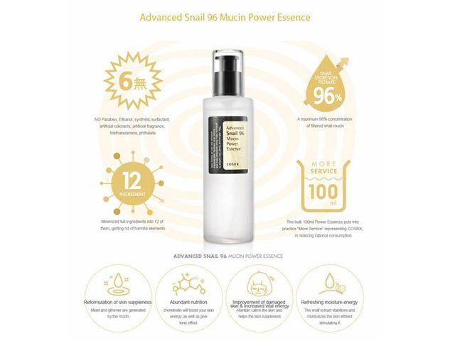 En fugtgivende essens, der består af 92% filtrering af sneglesekretion. COSRX Advanced Snail 96 Mucin Power Essence er en fugtgivende essens, der består af 92% Snail Secretion-filtrat for at berolige huden og helbrede hudskader. Det leverer også vitaminer til næring af huden.