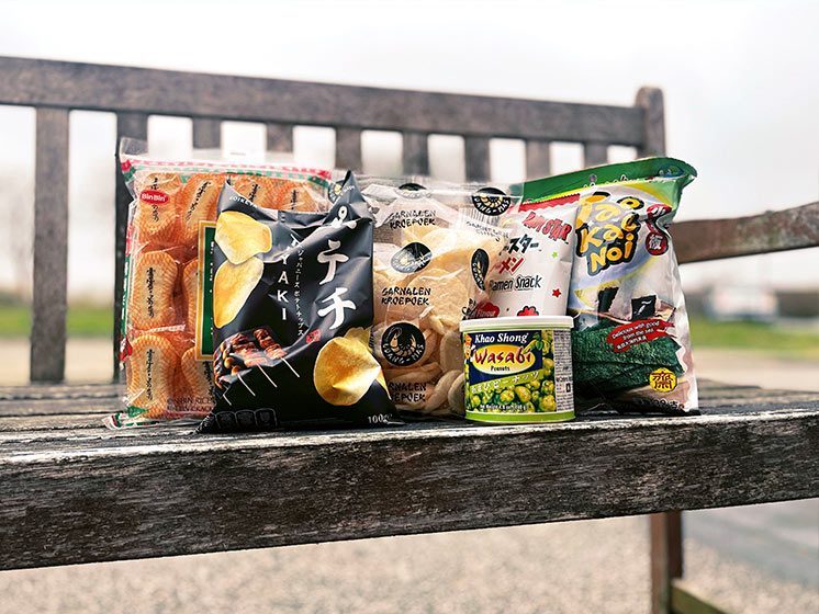Denne kasse indeholder alt fra populære koikeya teriyaki chips, bin bin crackers, hanami rejechips og meget mere…