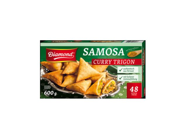 Grøntsagsfyld 55% (kål, løg, kartoffel, vand, grønne bønner, gulerødder, kartoffelstivelse, salt, SOJAbønneolie, karrypulver 0,6% [gurkemeje, kanel, fennikel, peber, kryddernødtræ, chili), smagsforstærker: monosodiumglutamat, sukker, hvidløg, hvid peber), dej 45% (HVEDEmel, vand, SOJAbønneolie).Næringsdeklaration: