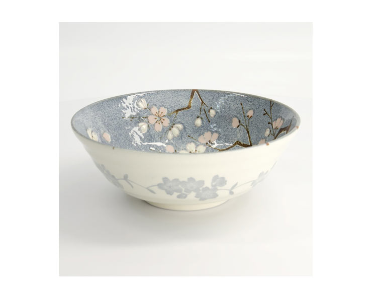 Fujisakura Ramen Bowl er mere end bare en skål – det er en oplevelse. Det smukke grå porcelæn indrammes af et delikat sakura-motiv i indersiden, hvor kirsebærblomster i lyse nuancer spreder sig over en stenet baggrund. Kontrasten mellem det kølige ydre og det florlette indre giver skålen et harmonisk, poetisk udtryk.