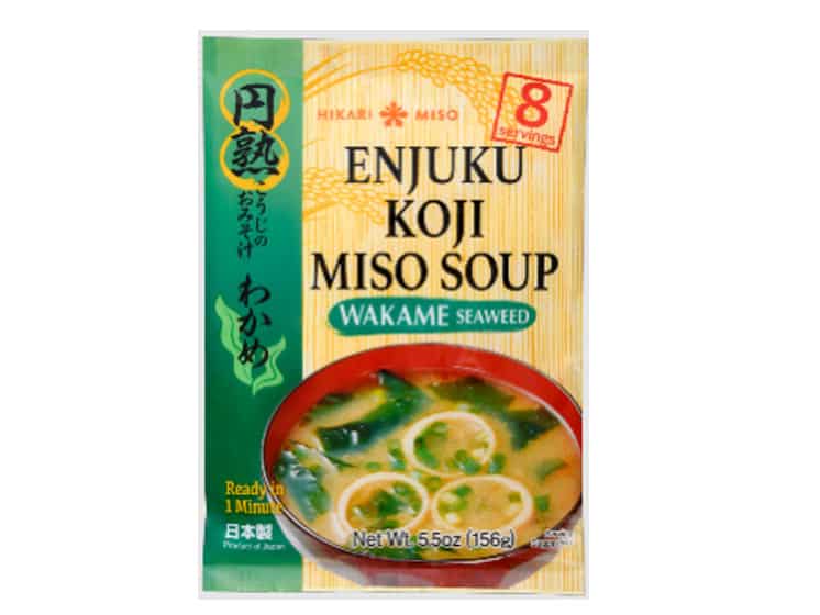 Suppen indeholder tørret wakame-tang, som folder sig ud i suppen og giver en mild havsmag.