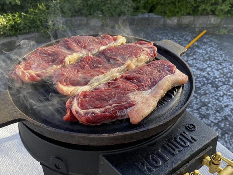 Forsiden af ​​HOT WOK Grillpan er perfekt egnet til både traditionel fastfood og bøffer. Bagsiden af ​​HOT WOK Grillpanden kan bruges som pande til fx pandekager.