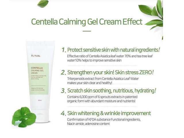 iUnik Centella Calming Gel Cream er en beroligende forfriskende creme gel, der bringer din hud tilbage til livet. Produktet er formuleret med fantastiske botaniske ingredienser såsom 70% Centella Asiatica bladvand, 10% tea tree bladvand og 6 spirekstrakter. Komponenterne arbejder sammen for at fugte, berolige pletter og levere antioxidanter og næringsstoffer for at genoprette og styrke huden. Indeholder niacinamid og adenosin for at gøre hudtonen lysere og bekæmpe aldringstegn. Gelteksturen muliggør hurtig absorption og afkøler hudtemperaturen efter påføring. Velegnet til følsom hud.