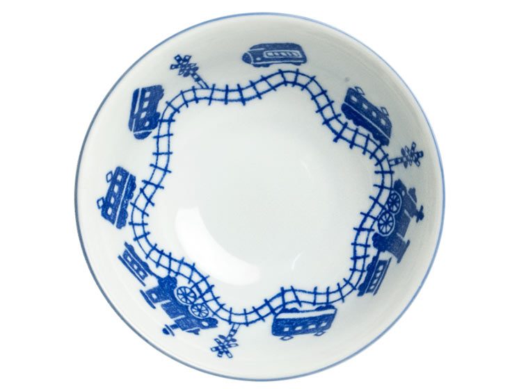 Skålen er dekoreret med tog, en jernbane og muligvis en bus, alt sammen i livlige blå farver.
