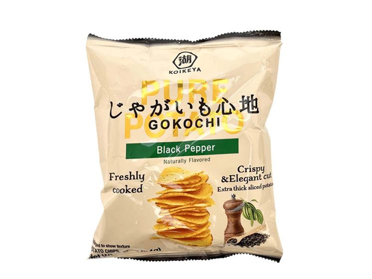 Koikeya Snack Chips Black Pepper er en velsmagende snack lavet af udvalgte kartoffelskiver, der er dyppet i en krydret blanding af sort peber og hemmelige ingredienser. Resultatet er en harmoni mellem den sprøde chip og den stærke, pikante smag af sort peber. Disse chips er en perfekt kombination af tekstur og smag og tilbyder en uforglemmelig snackoplevelse.