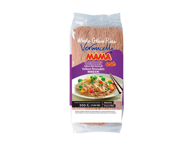 Fuldkornsrisnudler. Opbevares køligt og tørt. Ingredienser: Fuldkornsris 60%, ris, risklid, tapiokastivelse.