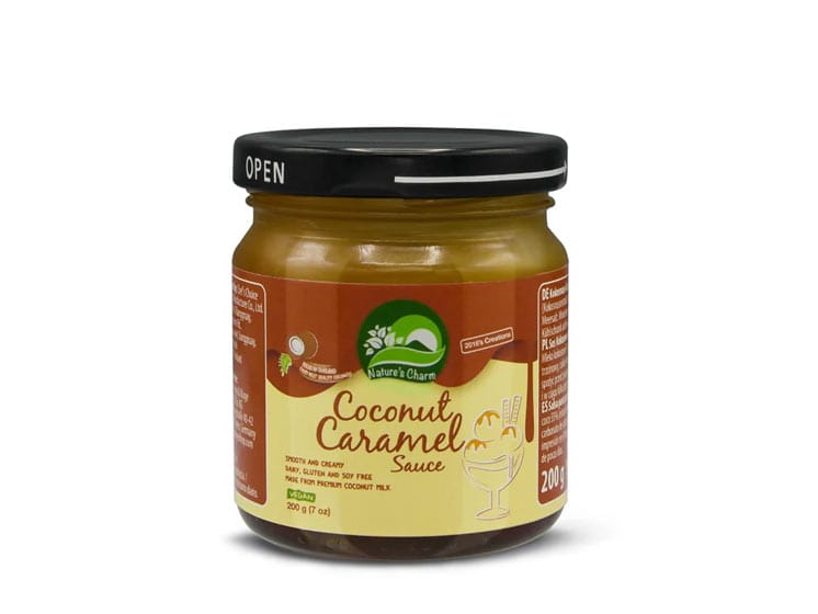 Nature’s Charm Coconut Caramel Sauce er en cremet karamelsauce med et strejf af kokos, der giver en eksotisk dybde til den klassiske karamelsmag. Den kan bruges både som topping og som ingrediens i desserter og drikke.