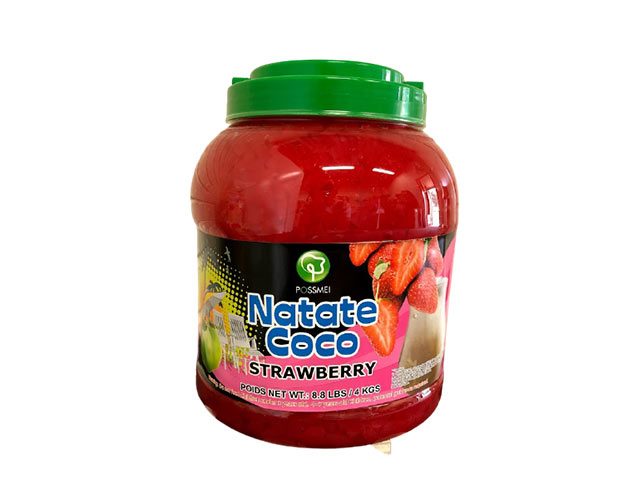 Natate coco (fermenteret kokosjuice), fruktose, sukker, vand, surhedsregulerende middel: E 330 (citronsyre), fortykningsmiddel: E 415 (xanthangummi), stabilisator: E 452 (kaliumpolyfosfat), jordbæraroma, konserveringsmiddel: E 202 (kaliumsorbat), farvestof: E 129 (Allura Red AC).