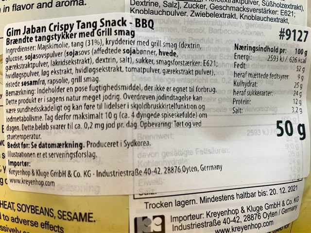 Majskimolie, tang 32 %, grillsmag-krydderier (maltodextrin, dextrose, SOJAsovspulver (affedtede SOJAbønner, maltodextrin, salt), sukker, smagsforstærker: E621), løgsmag-krydderier (dextrose, maltodextrin, løgpulver, antiklumpningsmiddel: E551), hvidløgspulver, krydderier med hvidløgssmag (dextrose, maltodextrin, hvidløgsolie, antiklumpningsmiddel: E551), tomatpulver, krydderier (dextrin, salt, aroma, røgs­mag, antiklumpningsmiddel: E551), gærekstraktpulver (gærekstrakt, salt, dextrin, xylose), ristede SESAMFRØ, krydderolie med grillsmag (rapsolie, grillsmag, naturlig smag).