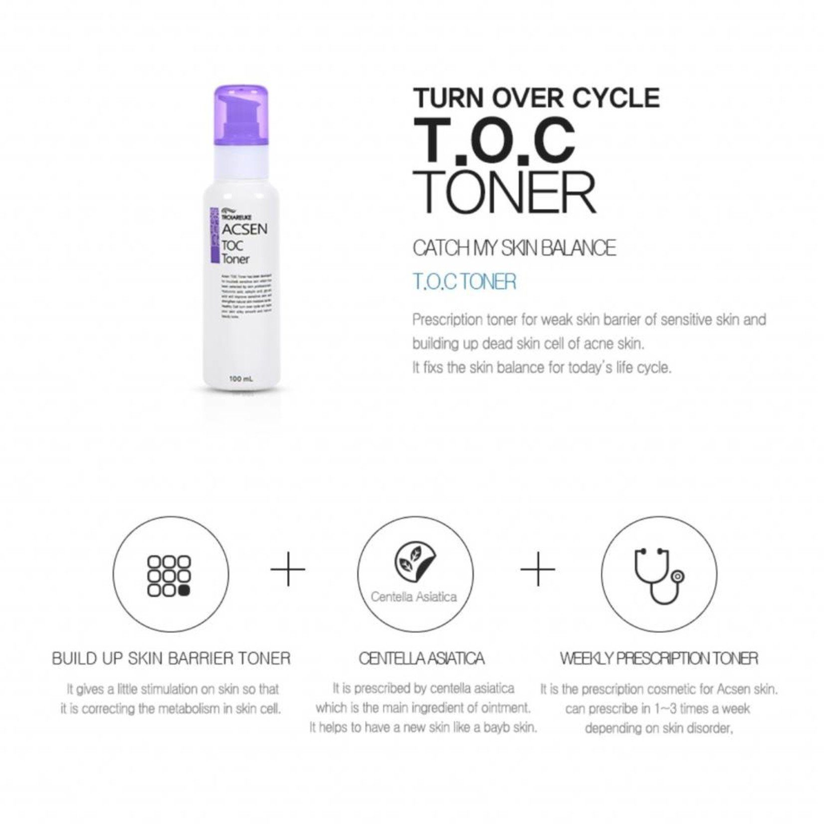 Troiareuke ASCEN TOC Toner virker til at balancere og forbedre hudens omsætningscyklus (TOC). TOC er en proces med hudfornyelse, som er en vigtig faktor for et generelt helbred af epidermis. Toneren er formuleret med hyaluronsyre, glykolsyre og salicylsyre og fjerner døde hudceller, beroliger og renser huden, mens den efterlades fugtet. Centella Asiatica ekstrakt fungerer som et antiinflammatorisk middel, der genopretter beskadiget hud. Dette balanceprodukt anbefales til tør følsom hud, acne -tilbøjelig hud og fedtet hud.