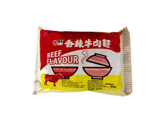 HVEDEmel (73 %), palmeolie, tapiokastivelse, salt, SOJAsovs (vand, SOJAbønner, HVEDE, salt), fortykningsmidler (E466, E412), fugtighedsbevarende midler (E452, E451, E339, E450), SESAMolie, surhedsregulerende middel (E501), antioxidant (E306), palmeolie, chilipasta (chili, salt), sojasovs (vand, SOJAbønner, HVEDE, salt), sukker, krydderier, ingefær, aroma, salt, smagsforstærkere (E621, E640, E631, E627), tørret kinakål, farve (E150a), maltodextrin, surhedsregulerende middel (E331), gærepulver, hydrolyseret SOJAprotein, glukose, gærekstrakt, xylose, antiklumpningsmiddel (E551), SOJAsovspulver (SOJAbønner, HVEDE, salt, maltodextrin), gærekstraktpulver, løgpulver. Allergener: Indeholder: (HVEDE), SOJA, SESAM.