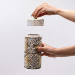 Den høje, cylinderformede silhuet gør krukken ideel som blikfang på hylder, borde eller i vindueskarme. Kombinationen af hvid og guld passer perfekt ind i både moderne, boheme- og etnisk inspirerede hjem.