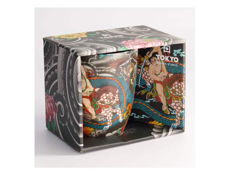 Yakuza Blue Dragon Krus er mere end blot en kop – det er et statement piece. Med sine detaljerede illustrationer af blå drager, krigere, heste og flyvende fugle skaber kruset en visuel fortælling, der oser af japansk tatoveringskunst og Yakuza-symbolik. Kruset rummer 340 ml og leveres i en eksklusiv gaveæske, hvilket gør det ideelt både som gave og til personlig forkælelse.