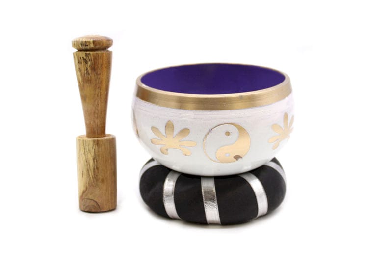 Dette Yin & Yang syngeskålsæt i hvid og lilla er fremstillet i Indien og kombinerer æstetik, symbolik og lyd i ét harmonisk produkt. Skålen er dekoreret med det klassiske Yin & Yang-symbol, som repræsenterer balance, harmoni og samspillet mellem modsatrettede energier.