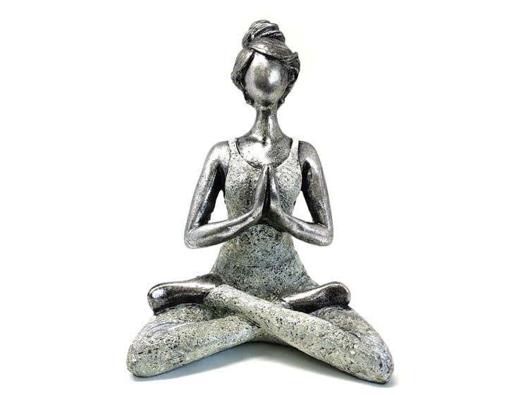 Den siddende yogaposition med hænderne samlet i Anjali Mudra (bønneposition) symboliserer taknemmelighed, balance og indre fred. Farvekombinationen i sølv og hvid skaber et roligt, tidløst look, som passer perfekt ind i både moderne og mere naturlige indretninger.