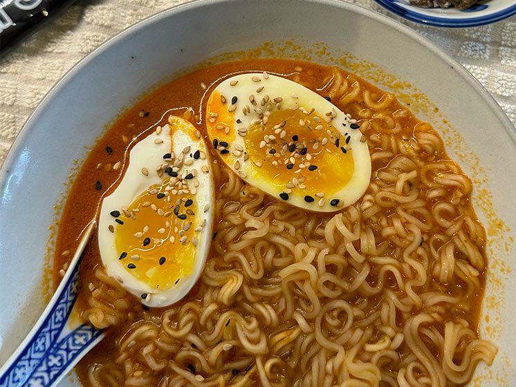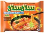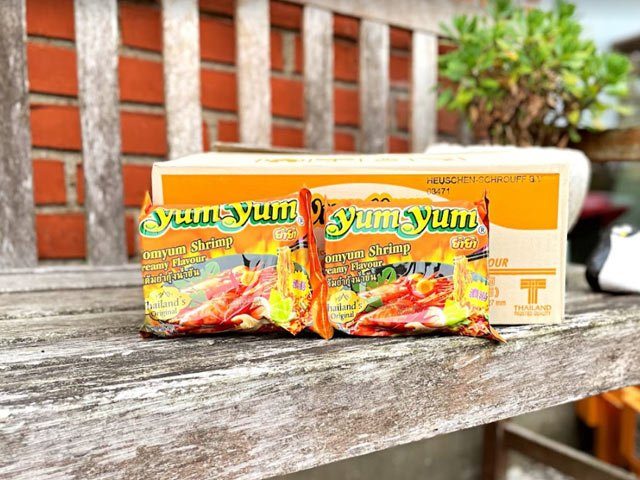 Nudlerne: HVEDEmel, pamleeolie, (indeholder antioxidant:E320) salt, sukker, modificeret majskastivelse, krydderier (peber, chilli,galanga), smagsforstærker : E621, E627, E631, krydderier (hvidløg, skalotteløg, forårsløg), modificeret majsstivelse, MÆLKEpulver(glukosesirup, hydrogeneret palmekerneolie, MÆLKEproteiner)Surhedsregulerende middel: E340, emulgator: E471), antiklumpningsmiddel: E551, syrer: E330, E296, SOJAsovspulver(indeholder SOJAbønner) HVEDE, glukosesirup, maltodextrin),farve:E150 c, syre: E330), farver: E171,E160c, surhedsregulerende midler: E500, E452, E451, E501, E331, urter(citrongræs, bergamooteblade),Fortykningsmidler: E415, E466, E412. FISKEsovs (ANSJOVS ekstrakt, salt) limearoma (indeholder SOJAlecithin), REJER 0,15%, gærekstrakt.Næringsdeklaration: